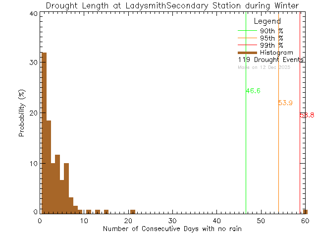These plots show histograms of consecutive days without rain at stations in the School-Based Weather Station Network. Each event is calculated by determing the number of dry days between two days that record rain. Long periods between rain events are considered droughts. The height of each bar gives the number of events with a particular length of dry spell between days with rain as percentage of the total number of events with at least one dry day between days with rain. All events are allocated to the season in which they start.