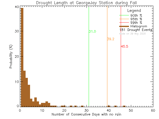 These plots show histograms of consecutive days without rain at stations in the School-Based Weather Station Network. Each event is calculated by determing the number of dry days between two days that record rain. Long periods between rain events are considered droughts. The height of each bar gives the number of events with a particular length of dry spell between days with rain as percentage of the total number of events with at least one dry day between days with rain. All events are allocated to the season in which they start.