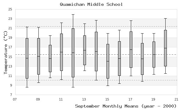 The values in the box and whisker plot are plotted so that the average daily minimum and average daily maximum are marked at the end of the whiskers, the mean value is shown with a horizontal tick across each box, and the boxes show the range of plus and minus one standard deviation from the mean value. The average of the daily average temperatures is shown with a dashed horizontal line and the average extremes are drawn with dotted lines.