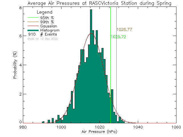 These plots show Probability Density Functions (PDFs) of daily average atmospheric pressure at stations in the UVic School-Based Weather Station Network. The vertical red bars show a histogram of daily average pressures. The data is fitted to one of three different probability distribution functions (Maximum or Minimum Gumbel and Gaussian), shown with a blue curve. The Gumbel distributions are appropriate for fitting sets of extreme values .e.g the set of maximum pressures. We select the fit function with the least error.