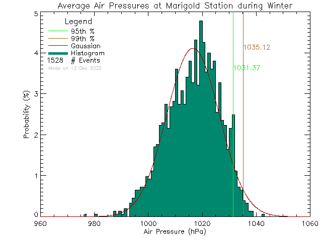 These plots show Probability Density Functions (PDFs) of daily average atmospheric pressure at stations in the UVic School-Based Weather Station Network. The vertical red bars show a histogram of daily average pressures. The data is fitted to one of three different probability distribution functions (Maximum or Minimum Gumbel and Gaussian), shown with a blue curve. The Gumbel distributions are appropriate for fitting sets of extreme values .e.g the set of maximum pressures. We select the fit function with the least error.