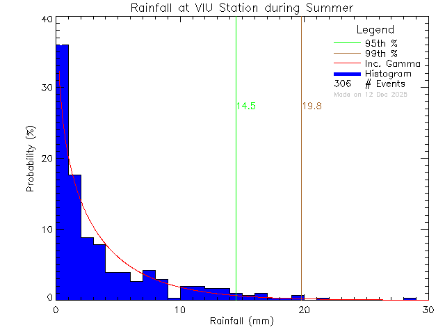 These plots show the Probability Density Functions (PDFs) of daily total rain at stations in the UVic School-Based Weather Station Network. The blue bars give the histogram of daily rain values (greater than zero) with bins of 1 mm. The red curve is the best fit to the histogram using a three-parameter gamma function. The orange and green vertical lines give the 95th and 99th percentile respectively. The number of days of rain and the percent of the total number of events that this represents are given in the last line of the legend.