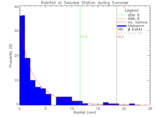 These plots show the Probability Density Functions (PDFs) of daily total rain at stations in the UVic School-Based Weather Station Network. The blue bars give the histogram of daily rain values (greater than zero) with bins of 1 mm. The red curve is the best fit to the histogram using a three-parameter gamma function. The orange and green vertical lines give the 95th and 99th percentile respectively. The number of days of rain and the percent of the total number of events that this represents are given in the last line of the legend.