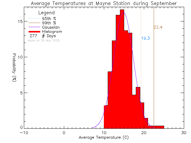 These plots show Probability Density Functions (PDFs) of daily average temperature at stations in the UVic School-Based Weather Station Network. The vertical red bars show a histogram of daily average temperatures. The data is fitted to one of three different probability distribution functions (Maximum or Minimum Gumbel and Gaussian), shown with a blue curve. The Gumbel distributions are appropriate for fitting sets of extreme values .e.g the set of maximum temperatures. We select the fit function with the least error.
