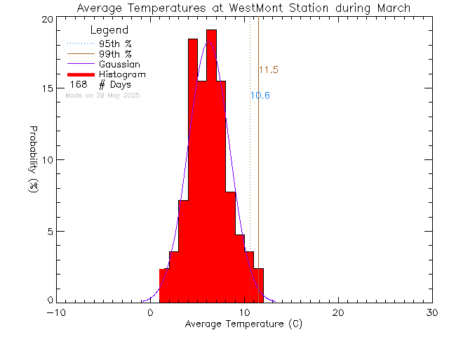 These plots show Probability Density Functions (PDFs) of daily average temperature at stations in the UVic School-Based Weather Station Network. The vertical red bars show a histogram of daily average temperatures. The data is fitted to one of three different probability distribution functions (Maximum or Minimum Gumbel and Gaussian), shown with a blue curve. The Gumbel distributions are appropriate for fitting sets of extreme values .e.g the set of maximum temperatures. We select the fit function with the least error.