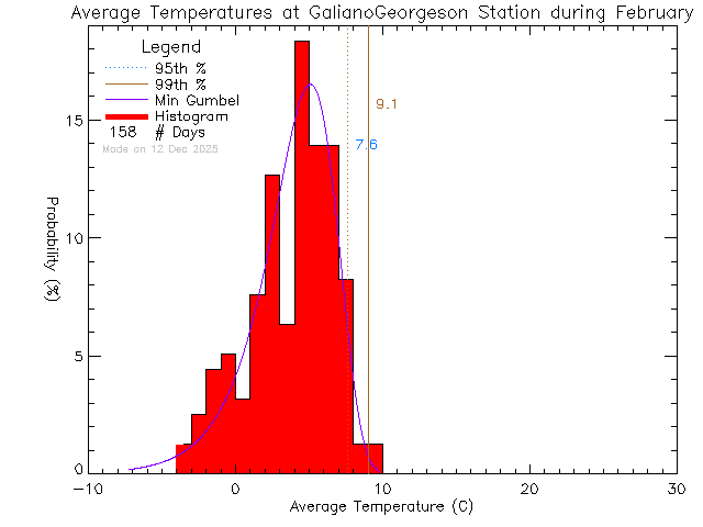 These plots show Probability Density Functions (PDFs) of daily average temperature at stations in the UVic School-Based Weather Station Network. The vertical red bars show a histogram of daily average temperatures. The data is fitted to one of three different probability distribution functions (Maximum or Minimum Gumbel and Gaussian), shown with a blue curve. The Gumbel distributions are appropriate for fitting sets of extreme values .e.g the set of maximum temperatures. We select the fit function with the least error.
