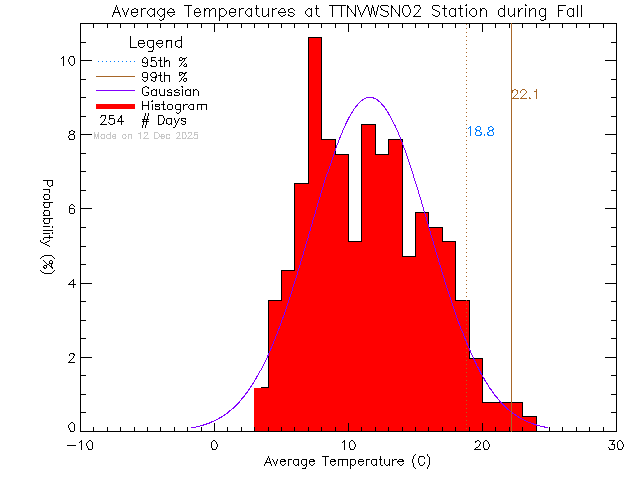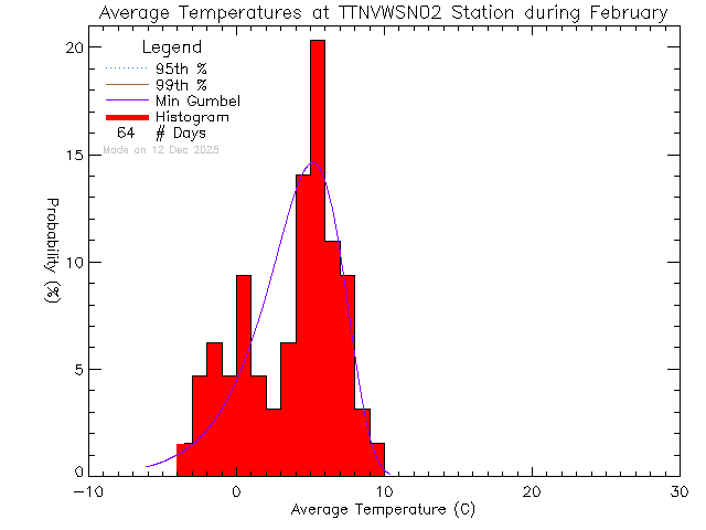 These plots show Probability Density Functions (PDFs) of daily average temperature at stations in the UVic School-Based Weather Station Network. The vertical red bars show a histogram of daily average temperatures. The data is fitted to one of three different probability distribution functions (Maximum or Minimum Gumbel and Gaussian), shown with a blue curve. The Gumbel distributions are appropriate for fitting sets of extreme values .e.g the set of maximum temperatures. We select the fit function with the least error.