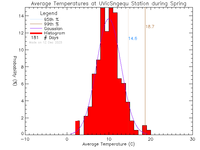 These plots show Probability Density Functions (PDFs) of daily average temperature at stations in the UVic School-Based Weather Station Network. The vertical red bars show a histogram of daily average temperatures. The data is fitted to one of three different probability distribution functions (Maximum or Minimum Gumbel and Gaussian), shown with a blue curve. The Gumbel distributions are appropriate for fitting sets of extreme values .e.g the set of maximum temperatures. We select the fit function with the least error.