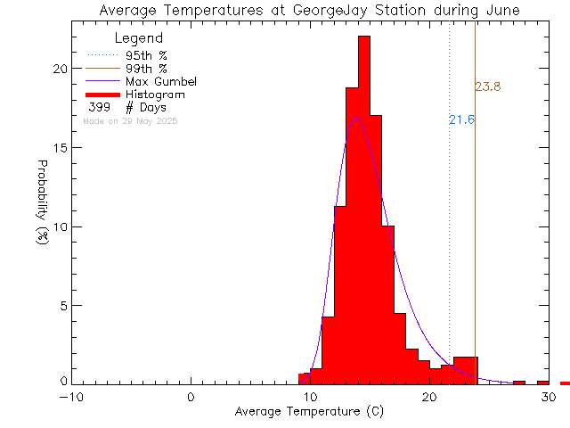 These plots show Probability Density Functions (PDFs) of daily average temperature at stations in the UVic School-Based Weather Station Network. The vertical red bars show a histogram of daily average temperatures. The data is fitted to one of three different probability distribution functions (Maximum or Minimum Gumbel and Gaussian), shown with a blue curve. The Gumbel distributions are appropriate for fitting sets of extreme values .e.g the set of maximum temperatures. We select the fit function with the least error.